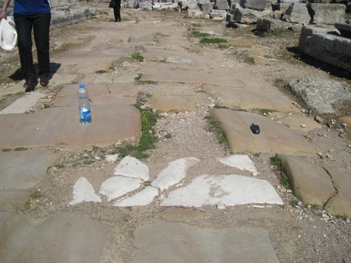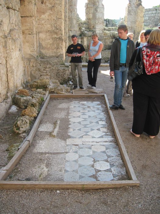 Дорожки и половые покрытия из мрамора и мозайки в Перге специально засыпали гравием, чтобы это все не разрушалось туристами. Лишь часть специально оставили и огородили, чтобы показать как было.