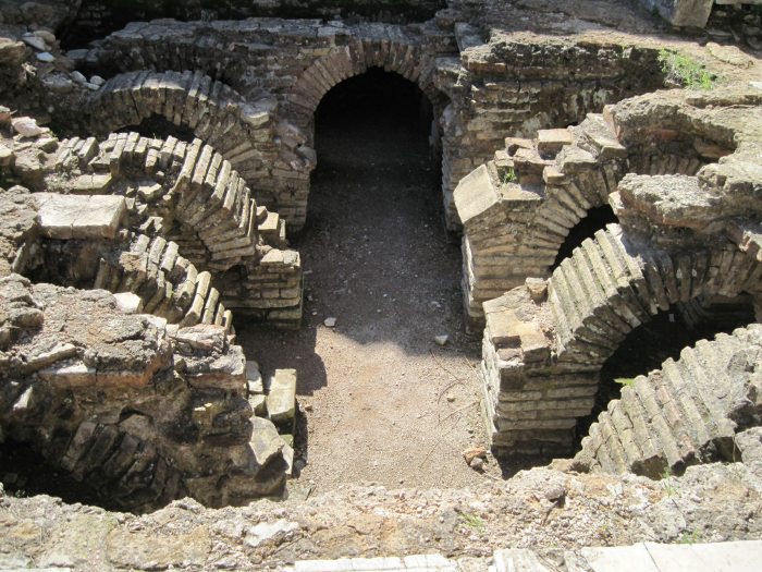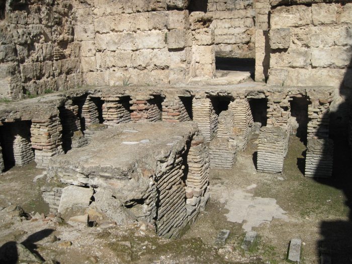 А это термы. В термах с помощью печи нагревались вода и воздух, которые затем циркулировали под полом и в полостях стен. При этом использовались двойные покрытия, чтобы пол не был очень горячим. Верхнее покрытие состояло из больших кирпичей, слоя битой глины и основного покрытия. Все это держалось на небольших кирпичных опорах, которые сразу размещали в шахматном порядке.