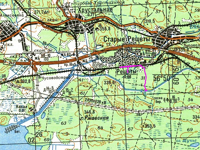 Электричка немного отклонилась от расписания, т.к. ехала немного медленно и перед ВИЗом дважды останавливалась (может быть стоп-кран?). В итоге приехали в Решеты в половине третьего часа. Времени в запасе до обратной электрички всего 2 часа. Вариантов подходов к каналу было два: