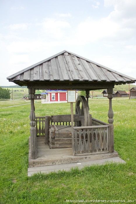 Действующий колодец с колесом начала 20 века. Состоит из бревенчатого сруба, уходящего в землю на 15 м. В сруб вмонтировано деревянное колесо в диаметре 150 см, сделанное из сосны. Колесо, вращаясь, приводит в движение валик. К нему крепится веревка или цепь, с помощью которых поднимается наполненная водой бадья (ведро). Перевезено колесо из д.Савиной. Над колодцем четырёхскатная крыша, поддерживаемая четырьмя резными столбами, между которыми - перила с просечной резьбой.