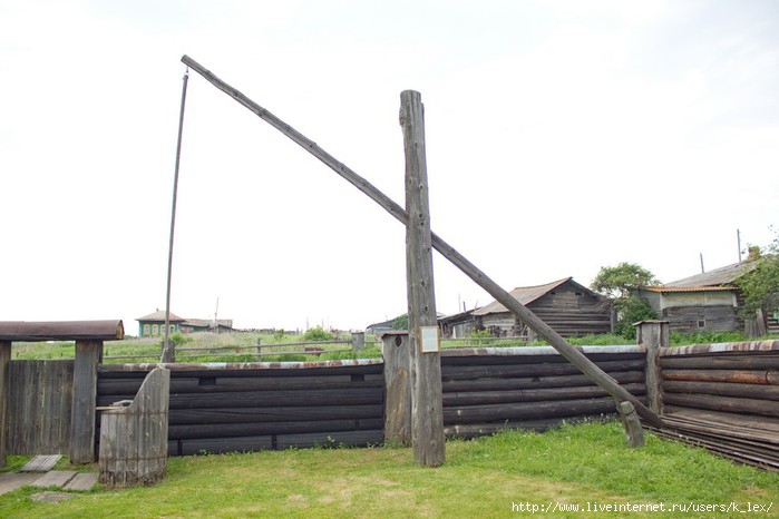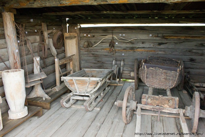 И вот мы посещаем последний "экспонат" "изнутри". Крестьянская усадьба 17 века содержит все надворные постройки, необходимые для жизни людей в деревне: здесь кроме избы и амбара есть холодный и тёплый сараи, навесы, погреб с подъямником, баня "по-черному", колодец с "журавлем". Всё подворье обнесено мощной оградой (заплотом) - стеной из бревен. Ворота под стать ограде: сделаны из вековых деревьев, наверху, как крыша, укреплено расколотое вдоль бревно.