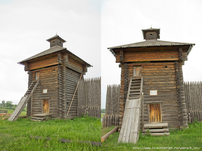 Неподалеку стоит башня Арамашевского острога. К ней примыкает частокол из заостренных сверху бревен. В отличие от большинства других строений, это не перенесенное из других сел и деревень строение, а реконструкция. Крепости и остроги на Урале ставили лишь в 17-18 веках для защиты от набегов татар и башкир. С тех пор прошло много времени и до нас они просто не дошли. А этот острог когда-то стоял на высокой, живописной скале над рекой Реж, где сейчас стоит каменная церковь, видимо на