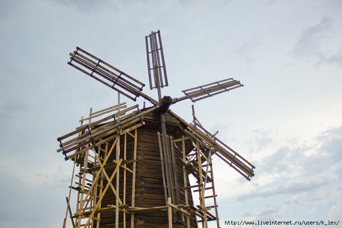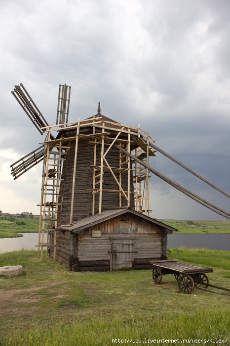 И направляемся к ветряной мельнице. Мельница была построена в 1916 году в деревне Мочищенск глухого Гаринского района, а перевезена сюда в 1985 году. Лопасти мельницы закреплены, поэтому не вращаются (хотя могли бы). Это самый отдаленный экспонат музея-заповедника, расположенный на левом берегу пруда. На земле около мельницы лежит каменный жернов. С помощью него в мельнице мололи зерно.